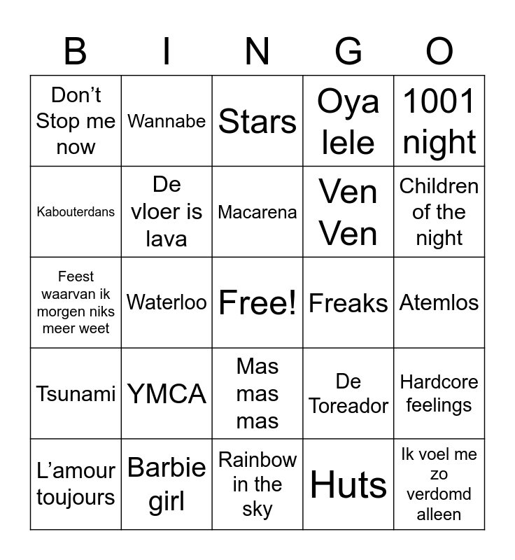 This bingo card has a free space and 69 words: Het kuikentje piep, Atemlos, Captain Jack, Have you ever been mellow, Barbie girl, I want it that way, Oya lele, Were going to Ibiza, 1001 night, Mamma Mia, Hardcore feelings, Cowboy, Don’t Stop me now, Stars, One more time, Waterloo, Mas mas mas, Ven Ven, Rainbow in the sky, Tsunami, Freaks, De Toreador, Children of the night, Arcade, Feest waarvan ik morgen niks meer weet, Atje voor de sfeer, Viva Hollandia, Dame tu Cosita, Huts, The lion sleeps tonight, Wannabe, Despacito, Gangnam style, Laat het los, I will always love you, What makes you beautiful, Que si Que no, Girl just wanna have fun, Kabouterdans, Follow the leader, YMCA, Ik voel me zo verdomd alleen, Tringeling, Grease mega mix, Springen nondeju, L’amour toujours, Links rechts, Leef, Dans met tante Rita, De vloer is lava, Macarena, Mas mas mas, Ven Ven, Rainbow in the sky, Tsunami, Freaks, De Toreador, Children of the night, Arcade, Feest waarvan ik morgen niks meer weet, Atje voor de sfeer, Viva Hollandia, Dame tu Cosita, Huts, The lion sleeps tonight, Wannabe, Despacito, Gangnam style and Laat het los.