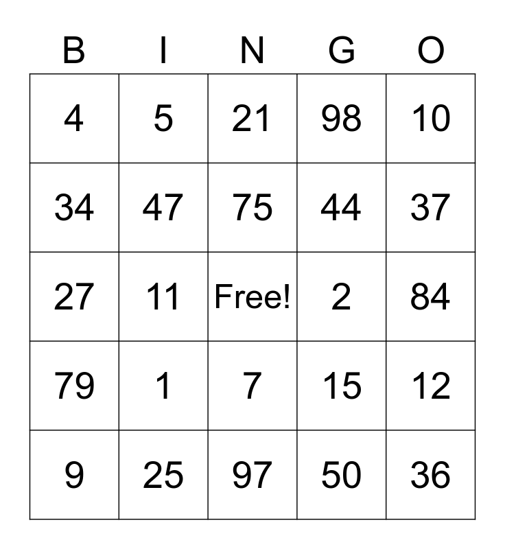 This bingo card has a free space and 24 words: 1, 25, 75, 9, 10, 4, 34, 5, 2, 7, 44, 27, 15, 12, 47, 50, 84, 21, 37, 11, 36, 79, 98 and 97.