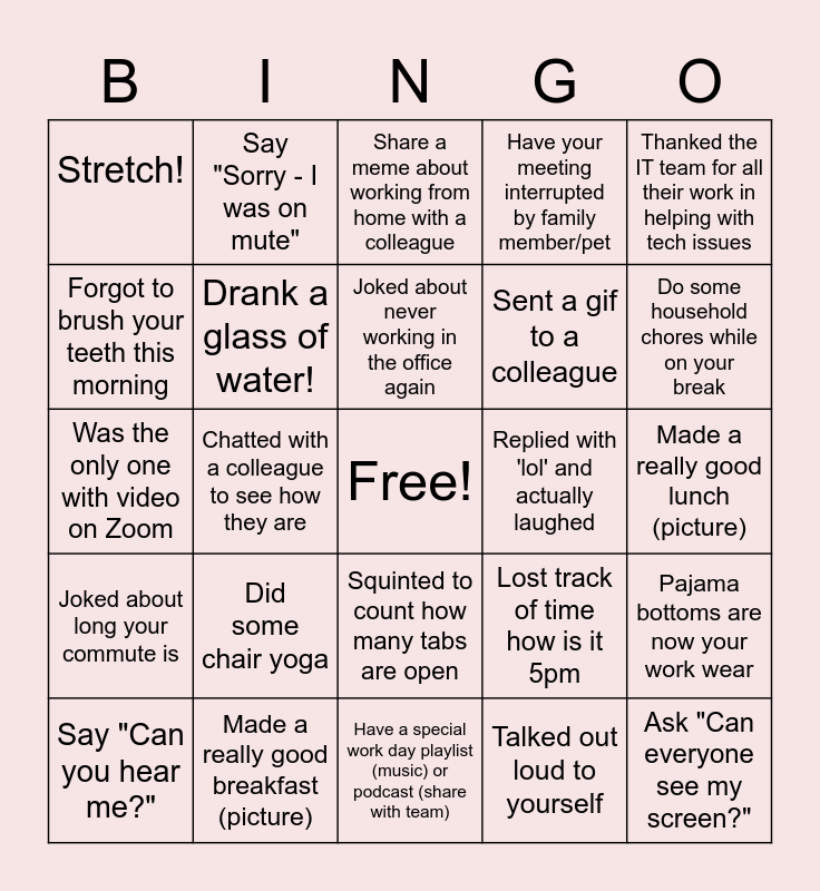This bingo card has a free space and 25 words: Say "Can you hear me?", Did some chair yoga, Joked about never working in the office again, Talked out loud to yourself, Do some household chores while on your break, Stretch!, Say "Sorry - I was on mute", Share a meme about working from home with a colleague, Sent a gif to a colleague, Pajama bottoms are now your work wear, Was the only one with video on Zoom, Drank a glass of water!, Lost track of time how is it 5pm, Ask "Can everyone see my screen?", Forgot to brush your teeth this morning, Made a really good breakfast (picture), Have a special work day playlist (music) or podcast (share with team), Have your meeting interrupted by family member/pet, Made a really good lunch (picture), Joked about long your commute is, Chatted with a colleague to see how they are, Squinted to count how many tabs are open, Replied with 'lol' and actually laughed, Thanked the IT team for all their work in helping with tech issues and Give a coworker a shout out in huddle.