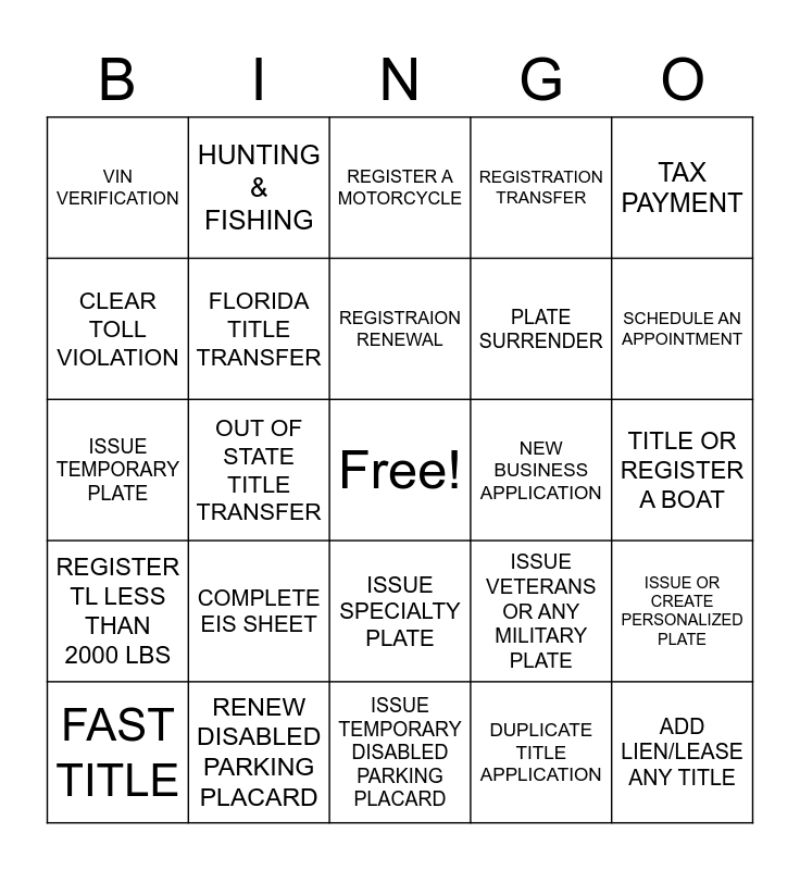 This bingo card has a free space and 24 words: COMPLETE EIS SHEET, RENEW DISABLED PARKING PLACARD, REGISTRAION RENEWAL, FAST TITLE, TAX PAYMENT, VIN VERIFICATION, CLEAR TOLL VIOLATION, HUNTING & FISHING, NEW BUSINESS APPLICATION, ISSUE SPECIALTY PLATE, PLATE SURRENDER, ISSUE TEMPORARY PLATE, ISSUE VETERANS OR ANY MILITARY PLATE, ISSUE OR CREATE PERSONALIZED PLATE, FLORIDA TITLE TRANSFER, DUPLICATE TITLE APPLICATION, TITLE OR REGISTER A BOAT, REGISTER A MOTORCYCLE, SCHEDULE AN APPOINTMENT, OUT OF STATE TITLE TRANSFER, ADD LIEN/LEASE ANY TITLE, REGISTER TL LESS THAN 2000 LBS, REGISTRATION TRANSFER and ISSUE TEMPORARY DISABLED PARKING PLACARD.