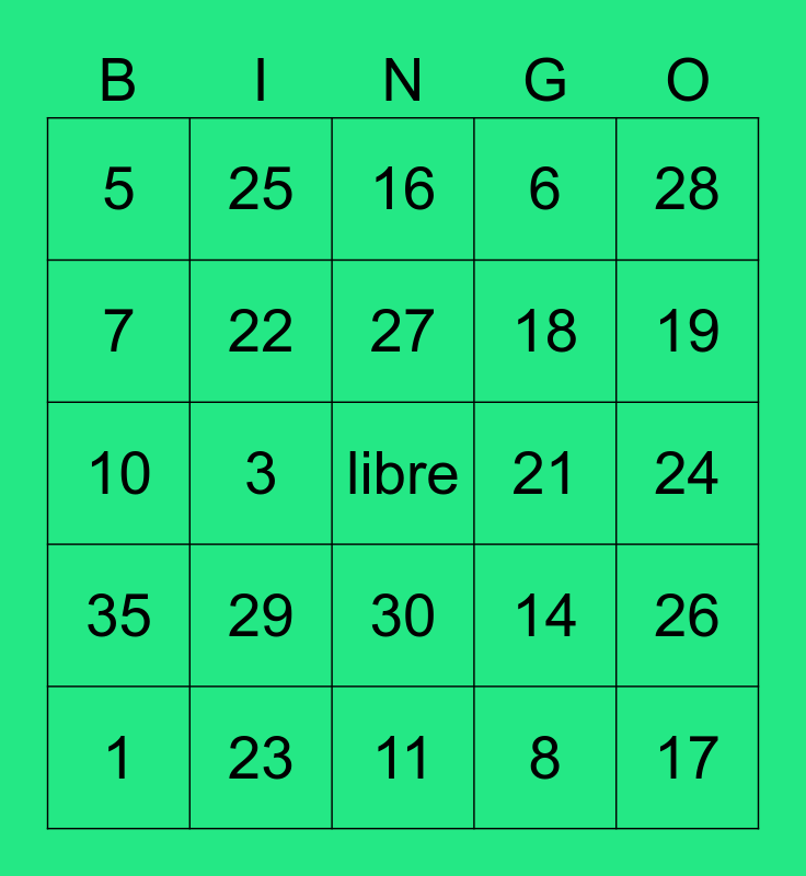 This bingo card has a free space and 29 words: 1, 2, 3, 4, 5, 16, 22, 29, 21, 23, 24, 17, 11, 8, 19, 20, 30, 35, 28, 10, 14, 15, 18, 7, 6, 25, 26, 27 and 23.