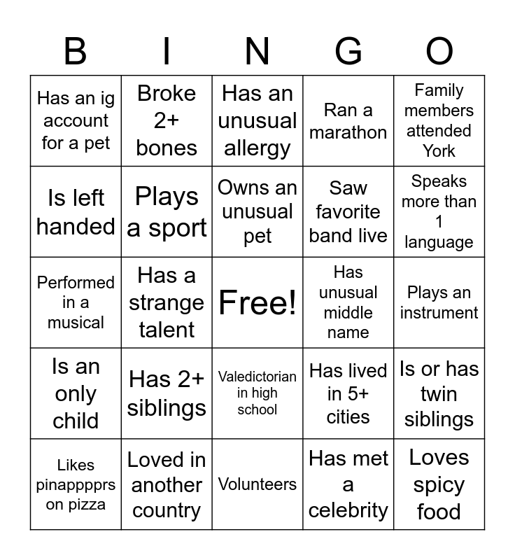 This bingo card has a free space and 24 words: Has 2+ siblings, Loved in another country, Owns an unusual pet, Likes pinapppprs on pizza, Family members attended York, Has an ig account for a pet, Is left handed, Broke 2+ bones, Has unusual middle name, Valedictorian in high school, Saw favorite band live, Performed in a musical, Has lived in 5+ cities, Is or has twin siblings, Plays a sport, Has met a celebrity, Plays an instrument, Has an unusual allergy, Speaks more than 1 language, Has a strange talent, Loves spicy food, Is an only child, Ran a marathon and Volunteers.