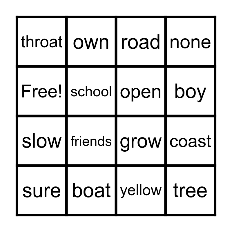 This bingo card has 16 words: boat, coast, road, throat, slow, own, grow, yellow, Free!, school, sure, none, friends, boy, open and tree.