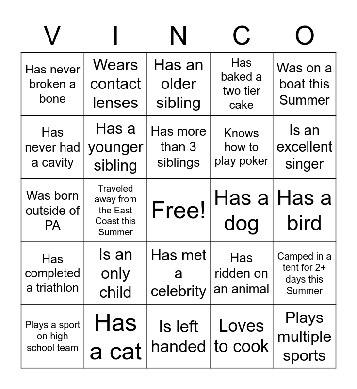 This bingo card has a free space and 29 words: Plays a sport on high school team, Has the same birthday as you (within one week), Traveled away from the East Coast this Summer, Spent their Summer at the beach, Has never broken a bone, Has an older sibling, Has a younger sibling, Is an only child, Has a dog, Has a cat, Has a bird, Plays multiple sports, Is left handed, Loves to cook, Is an excellent singer, Plays an instrument, Has met a celebrity, Has completed a triathlon, Was on a boat this Summer, Was born outside of PA, Has ridden on an animal, has had stitches, Knows how to play poker, Has never had a cavity, Has baked a two tier cake, Wears contact lenses, Camped in a tent for 2+ days this Summer, Has more than 3 siblings and Likes mushrooms on their pizza.