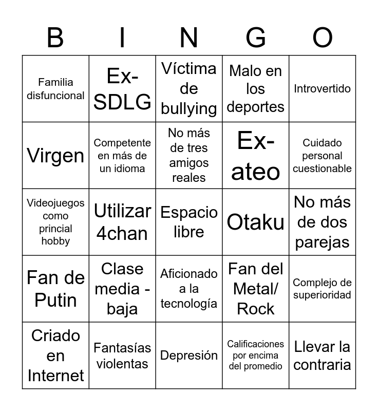 This bingo card has a free space and 24 words: Criado en Internet, Clase media - baja, No más de tres amigos reales, Calificaciones por encima del promedio, Introvertido, Familia disfuncional, Ex-SDLG, Víctima de bullying, Otaku, No más de dos parejas, Videojuegos como princial hobby, Competente en más de un idioma, Fan del Metal/ Rock, Complejo de superioridad, Virgen, Fantasías violentas, Depresión, Malo en los deportes, Cuidado personal cuestionable, Fan de Putin, Utilizar 4chan, Aficionado a la tecnología, Ex-ateo and Llevar la contraria.