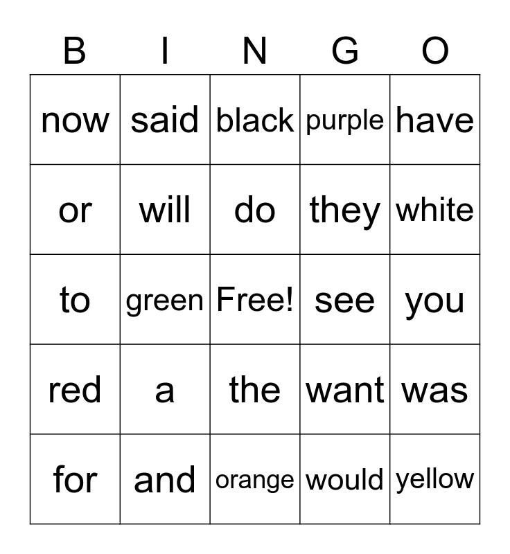 This bingo card has a free space and 24 words: a, and, do, for, have, now, or, said, see, the, they, to, want, was, will, would, you, black, white, green, yellow, red, purple and orange.