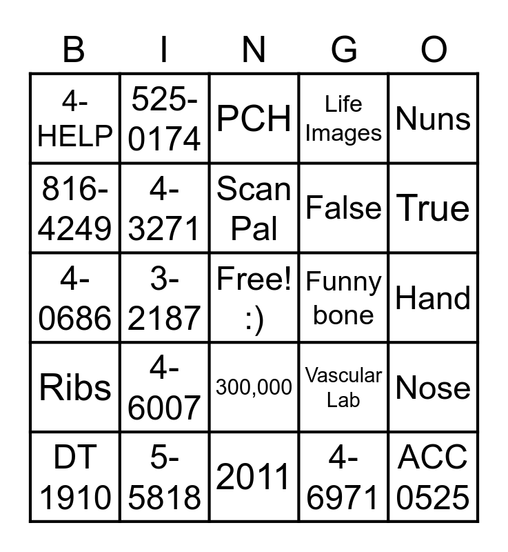 This bingo card has a free space and 24 words: 4-6007, 5-5818, Scan Pal, DT 1910, Nuns, 4-HELP, 816-4249, 525-0174, Funny bone, 300,000, False, 4-0686, Vascular Lab, Nose, 4-3271, 4-6971, Hand, PCH, True, 3-2187, ACC 0525, Ribs, Life Images and 2011.