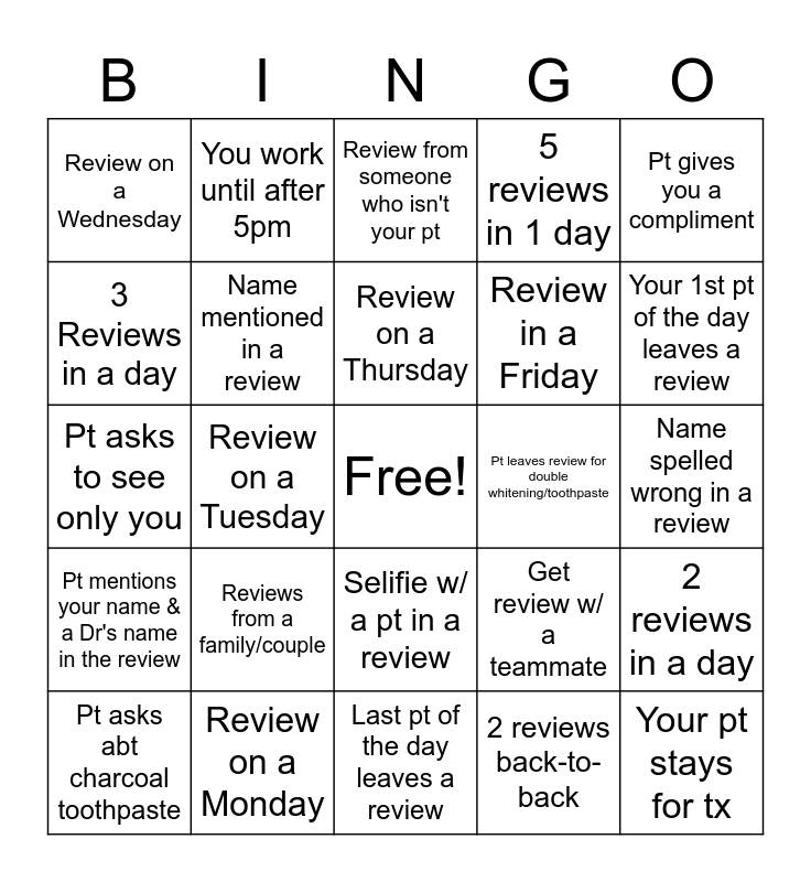 This bingo card has a free space and 24 words: Reviews from a family/couple, Review on a Monday, Review on a Thursday, Pt asks abt charcoal toothpaste, Pt gives you a compliment, Review on a Wednesday, 3 Reviews in a day, You work until after 5pm, Pt leaves review for double whitening/toothpaste, Selifie w/ a pt in a review, Review in a Friday, Pt asks to see only you, Get review w/ a teammate, 2 reviews in a day, Name mentioned in a review, 2 reviews back-to-back, Name spelled wrong in a review, Review from someone who isn't your pt, Your 1st pt of the day leaves a review, Review on a Tuesday, Your pt stays for tx, Pt mentions your name & a Dr's name in the review, 5 reviews in 1 day and Last pt of the day leaves a review.
