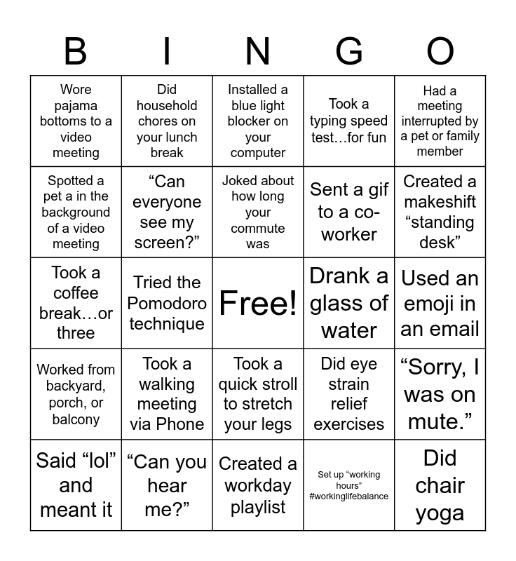 This bingo card has a free space and 24 words: Took a walking meeting via Phone, “Can you hear me?”, Joked about how long your commute was, Said “lol” and meant it, Had a meeting interrupted by a pet or family member, Wore pajama bottoms to a video meeting, Spotted a pet a in the background of a video meeting, Did household chores on your lunch break, Drank a glass of water, Took a quick stroll to stretch your legs, Sent a gif to a co-worker, Took a coffee break…or three, Did eye strain relief exercises, “Sorry, I was on mute.”, “Can everyone see my screen?”, Set up “working hours” #workinglifebalance, Used an emoji in an email, Installed a blue light blocker on your computer, Created a makeshift “standing desk”, Tried the Pomodoro technique, Did chair yoga, Worked from backyard, porch, or balcony, Took a typing speed test…for fun and Created a workday playlist.