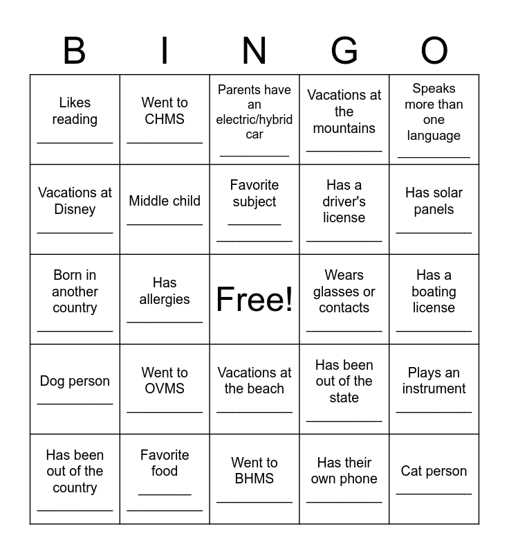 This bingo card has a free space and 35 words: Only child __________, Youngest sibling __________, Oldest sibling __________, Middle child __________, Vacations at the beach __________, Vacations at the mountains __________, Vacations at Disney __________, Favorite sport ________ __________, Favorite subject _______ __________, Born on a holiday __________, Born in another country __________, Speaks more than one language __________, Favorite Singer ______ __________, Likes camping __________, Likes reading __________, Wears glasses or contacts __________, Has their own phone __________, Has allergies __________, Dog person __________, Cat person __________, Has been out of the state __________, Has been out of the country __________, Plays an instrument __________, Favorite food _______ __________, Parents have an electric/hybrid car __________, Has solar panels __________, Likes to fish __________, Favorite color ______ __________, Has a driver's license __________, Has a boating license __________, Wants to be a scientist __________, Went to BHMS __________, Went to OVMS __________, Went to CHMS __________ and From out of district __________.