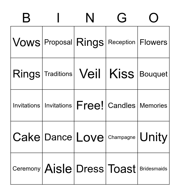 This bingo card has a free space and 24 words: Ceremony, Dance, Veil, Toast, Flowers, Vows, Proposal, Rings, Candles, Memories, Invitations, Traditions, Champagne, Unity, Rings, Aisle, Dress, Reception, Bouquet, Cake, Invitations, Love, Kiss and Bridesmaids.