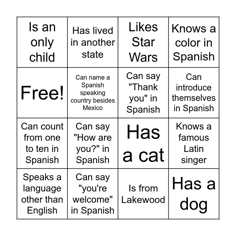 This bingo card has 16 words: Can say "you're welcome" in Spanish, Knows a famous Latin singer, Likes Star Wars, Is an only child, Can count from one to ten in Spanish, Has lived in another state, Has a cat, Is from Lakewood, Free!, Can name a Spanish speaking country besides Mexico, Speaks a language other than English, Knows a color in Spanish, Can say "How are you?" in Spanish, Can introduce themselves in Spanish, Can say "Thank you" in Spanish and Has a dog.