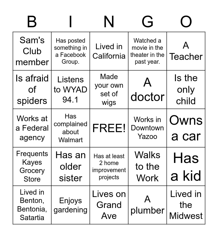This bingo card has a free space and 24 words: Has an older sister, Enjoys gardening, Made your own set of wigs, Lived in Benton, Bentonia, Satartia, A Teacher, Sam's Club member, Is afraid of spiders, Has posted something in a Facebook Group., Works in Downtown Yazoo, Has at least 2 home improvement projects, A doctor, Works at a Federal agency, Walks to the Work, Has a kid, Listens to WYAD 94.1, A plumber, Owns a car, Lived in California, Is the only child, Has complained about Walmart, Lived in the Midwest, Frequents Kayes Grocery Store, Watched a movie in the theater in the past year. and Lives on Grand Ave.