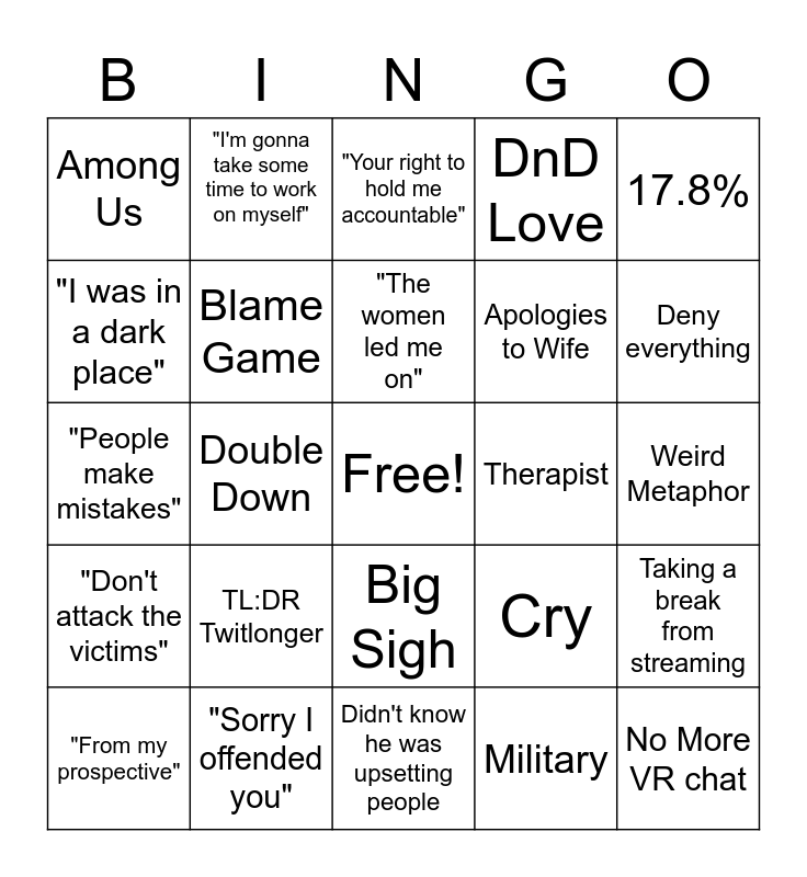 This bingo card has a free space and 24 words: TL:DR Twitlonger, "Sorry I offended you", "The women led me on", "From my prospective", 17.8%, Among Us, "I was in a dark place", "I'm gonna take some time to work on myself", Therapist, Big Sigh, Apologies to Wife, "People make mistakes", Cry, Taking a break from streaming, Blame Game, Military, Weird Metaphor, "Your right to hold me accountable", Deny everything, Double Down, No More VR chat, "Don't attack the victims", DnD Love and Didn't know he was upsetting people.