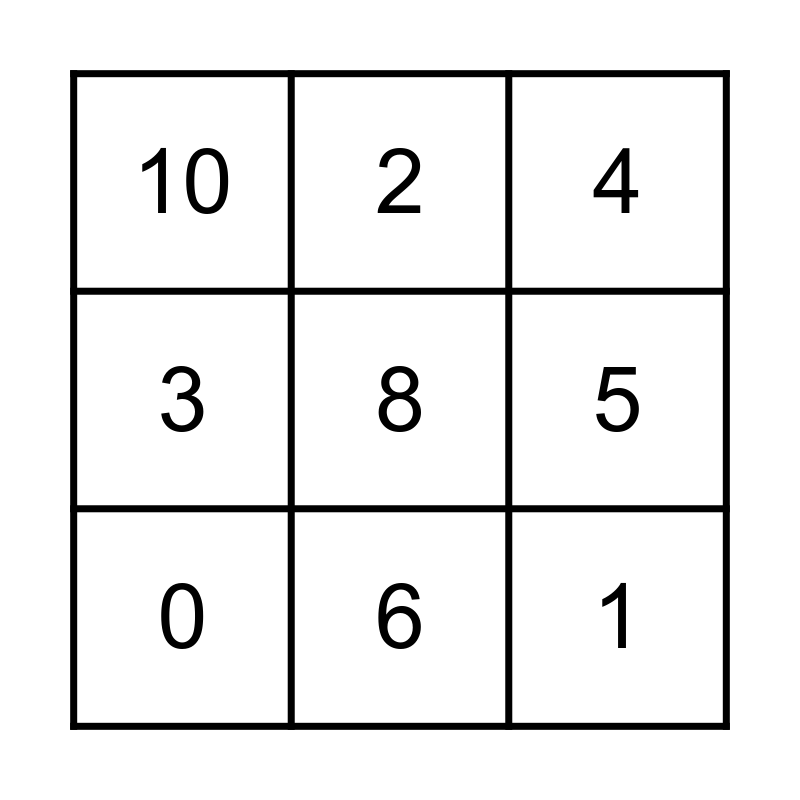 This bingo card has 11 words: 1, 6, 8, 0, 2, 4, 5, 7, 3, 10 and 9.
