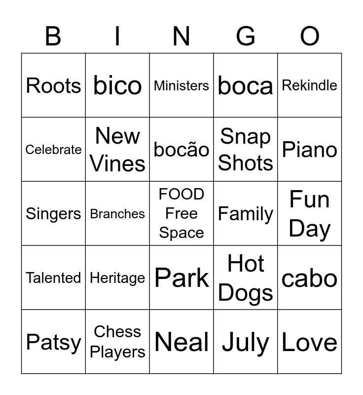 This bingo card has a free space and 29 words: Patsy, Generations, Branches, Ingram, Roots, Ministers, New Vines, Heritage, Family, Chess Players, Fun Day, Love, Neal, July, Piano, Guitar, Park, Talented, Rekindle, Singers, Hot Dogs, Bridge, Snap Shots, Celebrate, boca, bico, cabo, bocão and dedo.