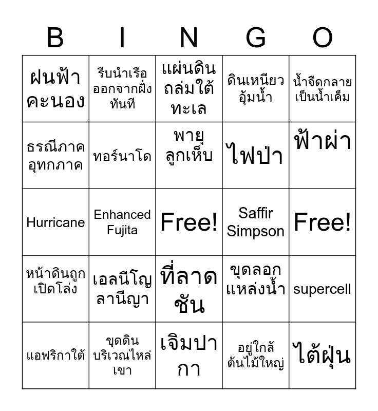This bingo card has 4 images, a free space and 29 words: ตัดไม้ทำลายป่า, ขุดดินบริเวณไหล่เขา, แผ่นดินถล่มใต้ทะเล, อุกกาบาตตกในทะเล, น้ำจืดกลายเป็นน้ำเค็ม, ฝนฟ้าคะนอง, ทอร์นาโด, พายุลูกเห็บ, Saffir Simpson, supercell, แอฟริกาใต้, Enhanced Fujita, อยู่ใกล้ต้นไม้ใหญ่, ไต้ฝุ่น, Hurricane, ไซโคลน, เจิมปากา, ขุดลอกแหล่งน้ำ, ฟ้าผ่า, หน้าดินถูกเปิดโล่ง, เอลนีโญ ลานีญา, ลดแก๊สเรือนกระจก, ไฟป่า, Free!, ธรณีภาค อุทกภาค, รีบนำเรือออกจากฝั่งทันที, ที่ลาดชัน, ดินเหนียวอุ้มน้ำ and ฝนไม่ตกต้องตามฤดูกาล.