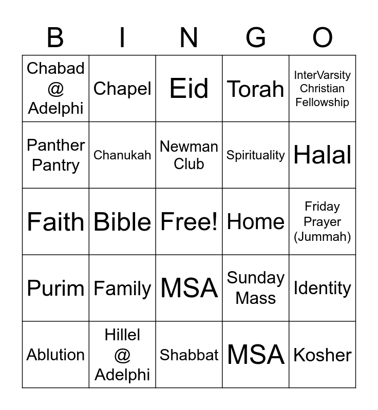 This bingo card has a free space and 26 words: MSA, MSA, Newman Club, Hillel @ Adelphi, InterVarsity Christian Fellowship, Chabad @ Adelphi, Panther Pantry, Chapel, Friday Prayer (Jummah), Sunday Mass, Spirituality, Faith, Identity, Ablution, Bible, Quran, Torah, Purim, Eid, Kosher, Halal, Shabbat, Home, Family, Chanukah and Easter.