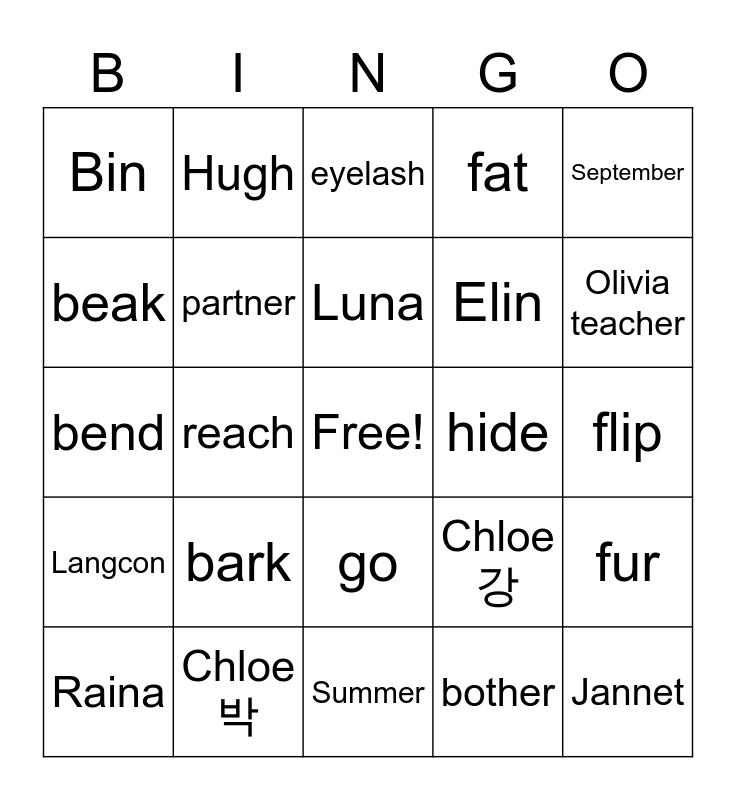 This bingo card has a free space and 24 words: bark, Chloe 박, Luna, Raina, September, Bin, beak, Hugh, hide, go, Elin, bend, Chloe강, fur, partner, bother, flip, eyelash, Olivia teacher, reach, Jannet, Langcon, fat and Summer.