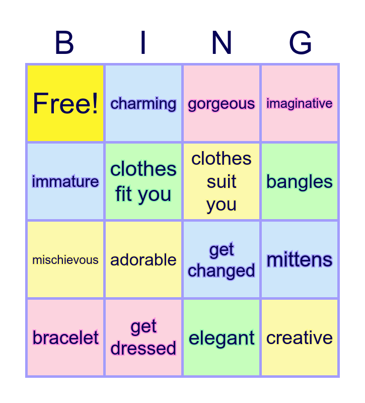 This bingo card has 16 words: bracelet, get dressed, gorgeous, imaginative, immature, charming, get changed, mittens, Free!, clothes fit you, elegant, bangles, mischievous, adorable, clothes suit you and creative.