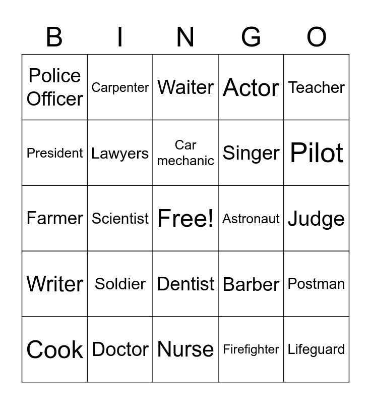 This bingo card has a free space and 24 words: Soldier, Doctor, Car mechanic, Cook, Teacher, Police Officer, President, Carpenter, Astronaut, Dentist, Singer, Farmer, Barber, Postman, Lawyers, Firefighter, Judge, Waiter, Pilot, Scientist, Lifeguard, Writer, Actor and Nurse.