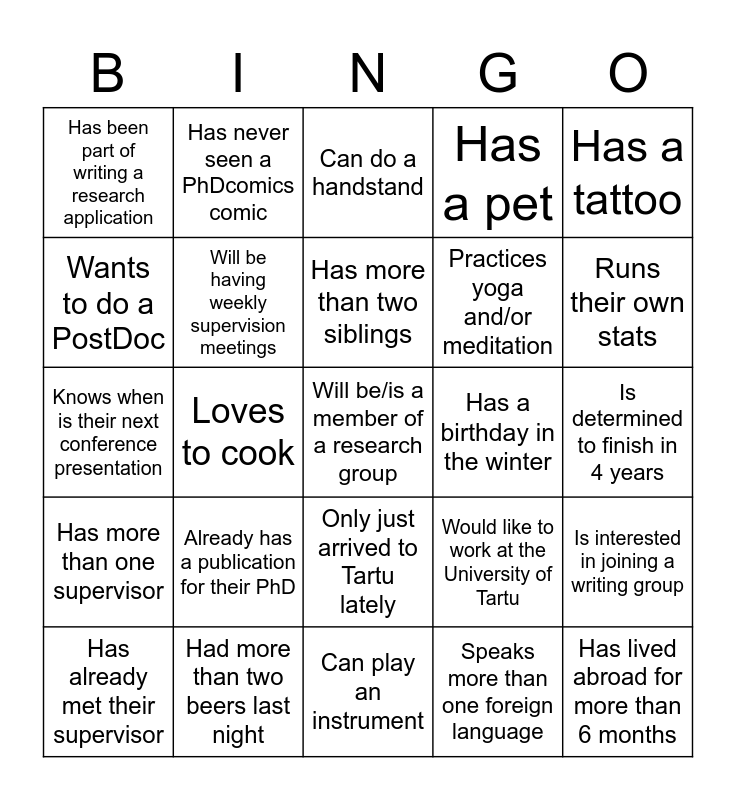 This bingo card has 25 words: Already has a publication for their PhD, Can play an instrument, Has more than two siblings, Has already met their supervisor, Has a tattoo, Has been part of writing a research application, Wants to do a PostDoc, Has never seen a PhDcomics comic, Has a birthday in the winter, Only just arrived to Tartu lately, Practices yoga and/or meditation, Knows when is their next conference presentation, Would like to work at the University of Tartu, Is interested in joining a writing group, Will be having weekly supervision meetings, Has lived abroad for more than 6 months, Is determined to finish in 4 years, Can do a handstand, Runs their own stats, Loves to cook, Will be/is a member of a research group, Had more than two beers last night, Has more than one supervisor, Has a pet and Speaks more than one foreign language.