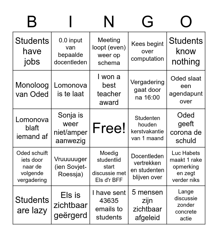 This bingo card has a free space and 25 words: Vruuuuuger (ien Sovjet-Roessja), I have sent 43635 emails to students, I won a best teacher award, Students are lazy, Students know nothing, Students have jobs, Monoloog van Oded, 0.0 input van bepaalde docentleden, Studenten houden kerstvakantie van 1 maand, Moedig studentlid start discussie met Els d'r BFF, Vergadering gaat door na 16:00, Lomonova blaft iemand af, Docentleden vertrekken en studenten blijven over, Luc Habets maakt 1 rake opmerking en zegt verder niks, Lomonova is te laat, Lomonova maakt random opmerking waaruit blijkt dat ze belangrijk is, Oded geeft corona de schuld, Meeting loopt (even) weer op schema, Oded slaat een agendapunt over, Sonja is weer niet/amper aanwezig, Lange discussie zonder concrete actie, Els is zichtbaar geërgerd, Oded schuift iets door naar de volgende vergadering, Kees begint over computation and 5 mensen zijn zichtbaar afgeleid.
