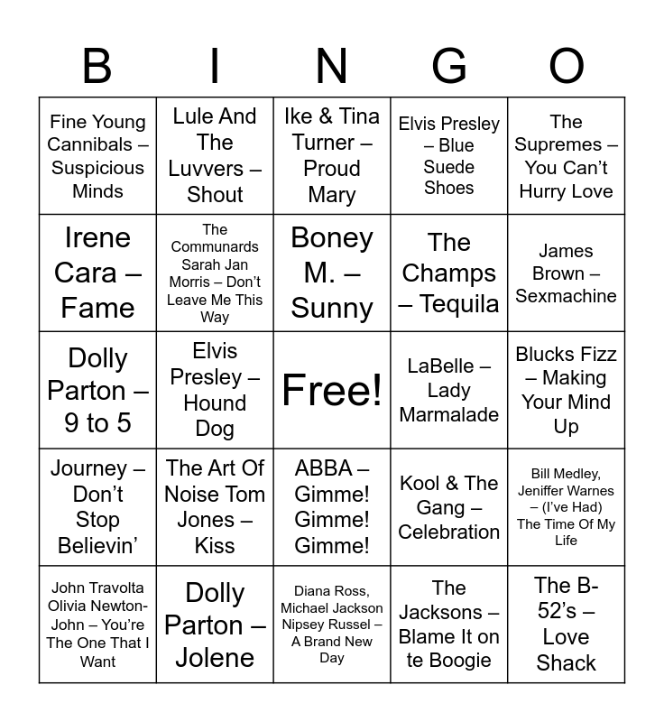 This bingo card has a free space and 89 words: 10cc – Dreadlock Holiday, ABBA – Does Your Mother Know, ABBA – Gimme! Gimme! Gimme!, ABBA – Lay All Your Love On Me, ABBA – Take A Change On Me, ABBA – Waterloo, Aretha Franklin – Think, Aretha Franklin- Respect, Barry Manilow – Copacabana, Barry White – You’re The First The Last My Everything, Bee Gees – Stayin Alive, Bill Haley & His Comets – Rock Around The Clock, Bill Medley, Jeniffer Warnes – (I’ve Had) The Time Of My Life, Blucks Fizz – Making Your Mind Up, Bob Marley & The Wailers – Three Little Birds, Boney M. – Sunny, Bruce Channel – Hey Baby, CHIC – Le Freak, Dan Hartman – Relight My Fire, DeBarge – Rythm Of The Night, Deniece Williams - Let’s Hear It for the Boy, Diana Ross – I’m Coming Out, Diana Ross, Michael Jackson Nipsey Russel – A Brand New Day, Dolly Dots – Love Me Just a Little Bit More, Dolly Parton – 9 to 5, Dolly Parton – Jolene, Donna Summer – Hot Stuff, Earth Wind & Fire The Emotions – Boggie Wonderland, Eath Wind & Fire – September, Elton John, Kiki Dee – Don’t Go Breaking My Heart, Elvis Presley – Blue Suede Shoes, Elvis Presley – Hound Dog, Eurythmics Annie Lennox Dave Stewart – Sweet Dreams (Are Made of This), Fine Young Cannibals – Suspicious Minds, Frankie Valli – Grease, Ike & Tina Turner – Proud Mary, Irene Cara – Fame, James Brown – I Got You (I Feel Good), James Brown – Sexmachine, John Travolta Olivia Newton- John – You’re The One That I Want, Journey – Don’t Stop Believin’, Karen Young – Hot Shot, KC & The Sunshine Band – Give It Up, Kool & The Gang – Celebration, Kool & The Gang – Celebration, LaBelle – Lady Marmalade, Lesley Gore – It’s My Party, Litte Richard – Tutti Frutti, Los Lobos – La Bamba, Lule And The Luvvers – Shout, Madonna – Holiday, Manfred Mann – Do Wah Diddy Diddy, Marcia Aitken – I’m Still In Love With You, Marianna Rosenberg – Ich bin wie du, Meat Loaf – Paradise By The Dashboard Light, Michael Jackson – The Way You Make Me Feel, Musical Youth – Pass The Dutchie, Pat Benatar – Love Is A Battlefield, Prince – Kiss, Prince – Let’s Go Crazy, Raffaella Carrà – A far l’amore comincia tu, Ray Charles – I’ve Got a Woman, Ronnie Tober, Ciska Peeters – Naar de Kermis, Sam The Sham & The Pharaohs, Shocking Blue – Venus, Sister Sledge – We Are Family, Sonny & Cher – I Got You Babe, Stevie Wonder - Superstition, Tavares - Heaven Must Be Missing An Angel, The Art Of Noise Tom Jones – Kiss, The B-52’s – Love Shack, The Beach Boys – I Get Around, The Blues Brothers – Everybody Needs Somebody to Love, The Champs – Tequila, The Communards Sarah Jan Morris – Don’t Leave Me This Way, The Jacksons – Blame It on te Boogie, The Jacksons – Can You Feel It, The Marcels – Blue Moon, The Pointer Sisters – I’m So Excited, The Sugarhill Gang – Rapper’s Delight, The Supremes – You Can’t Hurry Love, The Weather Girls – I’ts Raining Men, Tom Jones – It’s Not Unusual, Tom Jones Mousse T – Sexbomb, TOTO – Africa, Tracey Ullman – Breakaway, Van Morisson – Brown Eyed Girl, Wham! – Club Tropicana and Wham! – Wake Me Up Before You Go-Go.