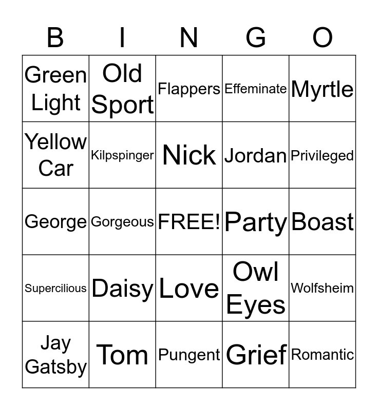 This bingo card has a free space and 24 words: Daisy, Tom, Nick, Jay Gatsby, Myrtle, Green Light, Yellow Car, Old Sport, Party, Love, Jordan, George, Owl Eyes, Wolfsheim, Kilpspinger, Grief, Boast, Flappers, Privileged, Gorgeous, Romantic, Supercilious, Effeminate and Pungent.