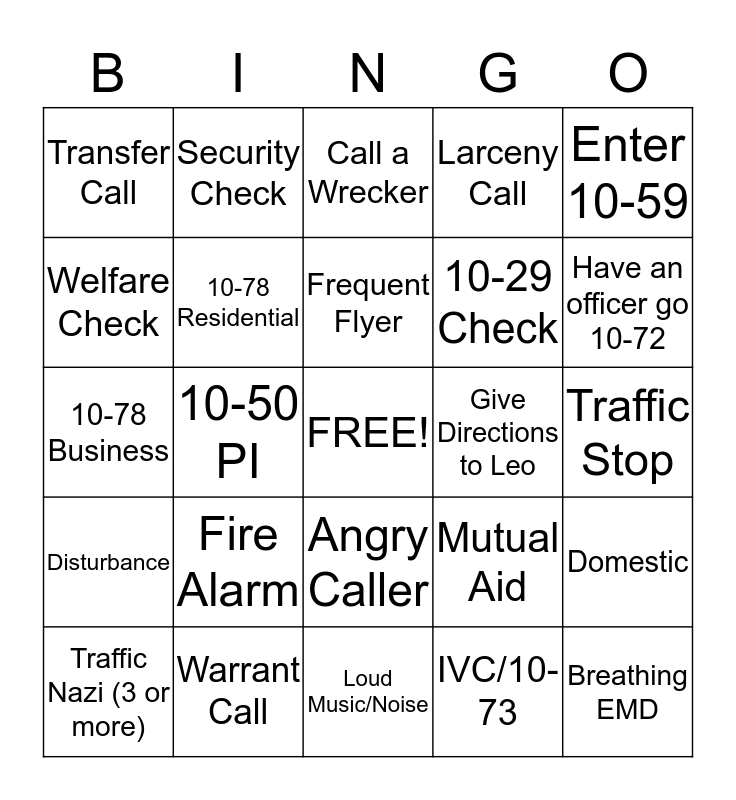 This bingo card has a free space and 24 words: Fire Alarm, Warrant Call, Frequent Flyer, Traffic Nazi (3 or more), Enter 10-59, Transfer Call, Welfare Check, Security Check, Give Directions to Leo, Angry Caller, 10-29 Check, 10-78 Business, Mutual Aid, Domestic, 10-78 Residential, IVC/10-73, Traffic Stop, Call a Wrecker, Have an officer go 10-72, 10-50 PI, Breathing EMD, Disturbance, Larceny Call and Loud Music/Noise.