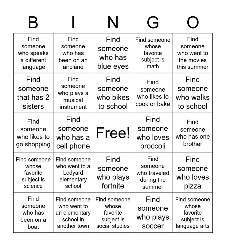 This bingo card has a free space and 24 words: Find someone who went to a Ledyard elementary school, Find someone who went to an elementary school in another town, Find someone who bikes to school, Find someone who has been on a boat, Find someone who went to the movies this summer, Find someone who speaks a different language, Find someone that has 2 sisters, Find someone who has been on an airplane, Find someone who loves broccoli, Find someone who plays fortnite, Find someone who likes to cook or bake, Find someone who likes to go shopping, Find someone who traveled during the summer, Find someone who loves pizza, Find someone who plays a musical instrument, Find someone who plays soccer, Find someone who has one brother, Find someone who has blue eyes, Find someone who walks to school, Find someone who has a cell phone, Find someone whose favorite subject is language arts, Find someone whose favorite subject is science, Find someone whose favorite subject is math and Find someone whose favorite subject is social studies.
