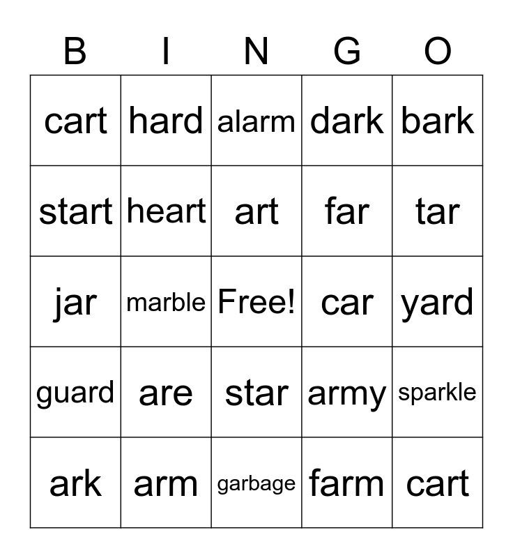 This bingo card has a free space and 24 words: are, arm, art, ark, bark, cart, start, hard, car, star, far, jar, army, sparkle, heart, farm, yard, alarm, tar, marble, cart, guard, dark and garbage.