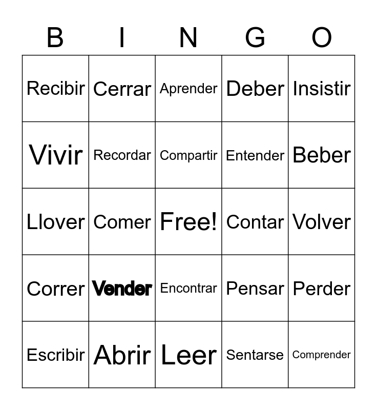 This bingo card has a free space and 24 words: Vender, Abrir, Compartir, Escribir, Insistir, Recibir, Vivir, Cerrar, Contar, Encontrar, Entender, Llover, Pensar, Perder, Recordar, Sentarse, Volver, Aprender, Beber, Comer, Comprender, Correr, Deber and Leer.