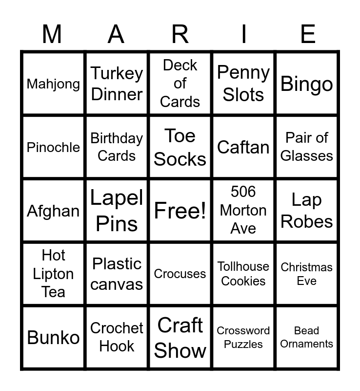 This bingo card has a free space and 24 words: Plastic canvas, Crochet Hook, Toe Socks, Bunko, Bingo, Mahjong, Pinochle, Turkey Dinner, 506 Morton Ave, Crocuses, Caftan, Afghan, Tollhouse Cookies, Christmas Eve, Birthday Cards, Crossword Puzzles, Lap Robes, Deck of Cards, Pair of Glasses, Lapel Pins, Bead Ornaments, Hot Lipton Tea, Penny Slots and Craft Show.