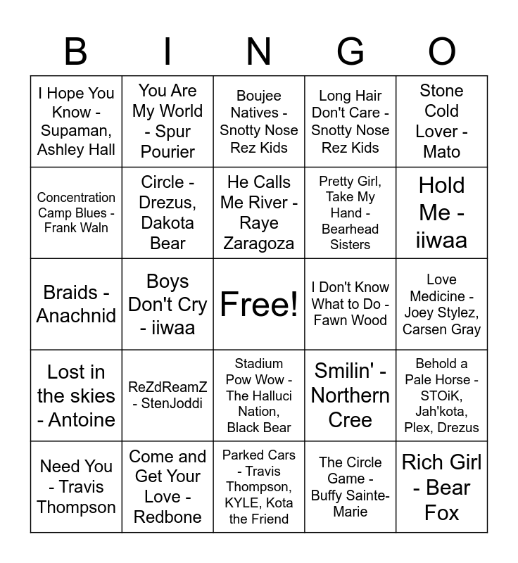 This bingo card has a free space and 30 words: Come and Get Your Love - Redbone, Tapwe Oma - Fawn Wood, Boys Don't Cry - iiwaa, NDN Kars - Keith Secola, I Hope You Know - Supaman, Ashley Hall, Boujee Natives - Snotty Nose Rez Kids, Circle - Drezus, Dakota Bear, Stadium Pow Wow - The Halluci Nation, Black Bear, I Don't Know What to Do - Fawn Wood, Parked Cars - Travis Thompson, KYLE, Kota the Friend, Love Medicine - Joey Stylez, Carsen Gray, Rich Girl - Bear Fox, The Circle Game - Buffy Sainte-Marie, Where Can My Man Be? - Fara Palmer, Hold Me - iiwaa, Electric Pow Wow Drum - The Halluci Nation, Smilin' - Northern Cree, Lost in the skies - Antoine, ReZdReamZ - StenJoddi, Stone Cold Lover - Mato, Braids - Anachnid, Knnow Better Do Better - Supaman, You Are My World - Spur Pourier, Pretty Girl, Take My Hand - Bearhead Sisters, Concentration Camp Blues - Frank Waln, Long Hair Don't Care - Snotty Nose Rez Kids, Behold a Pale Horse - STOiK, Jah'kota, Plex, Drezus, Need You - Travis Thompson, He Calls Me River - Raye Zaragoza and Sky Woman - Anachnid.