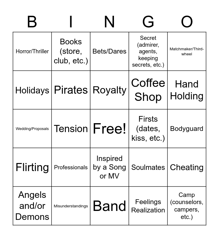 This bingo card has a free space and 24 words: Professionals, Misunderstandings, Royalty, Angels and/or Demons, Matchmaker/Third-wheel, Horror/Thriller, Holidays, Books (store, club, etc.), Firsts (dates, kiss, etc.), Inspired by a Song or MV, Coffee Shop, Wedding/Proposals, Soulmates, Cheating, Pirates, Feelings Realization, Bodyguard, Bets/Dares, Hand Holding, Tension, Camp (counselors, campers, etc.), Flirting, Secret (admirer, agents, keeping secrets, etc.) and Band.