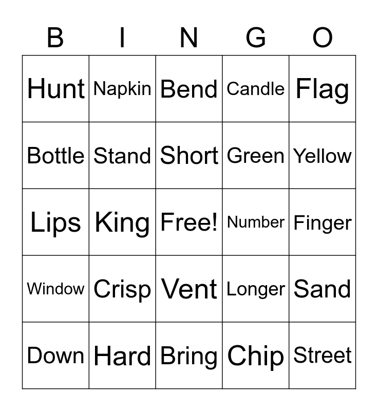 This bingo card has a free space and 24 words: Crisp, Hard, Short, Down, Flag, Hunt, Bottle, Napkin, Number, Vent, Green, Lips, Longer, Sand, Stand, Chip, Finger, Bend, Yellow, King, Street, Window, Candle and Bring.