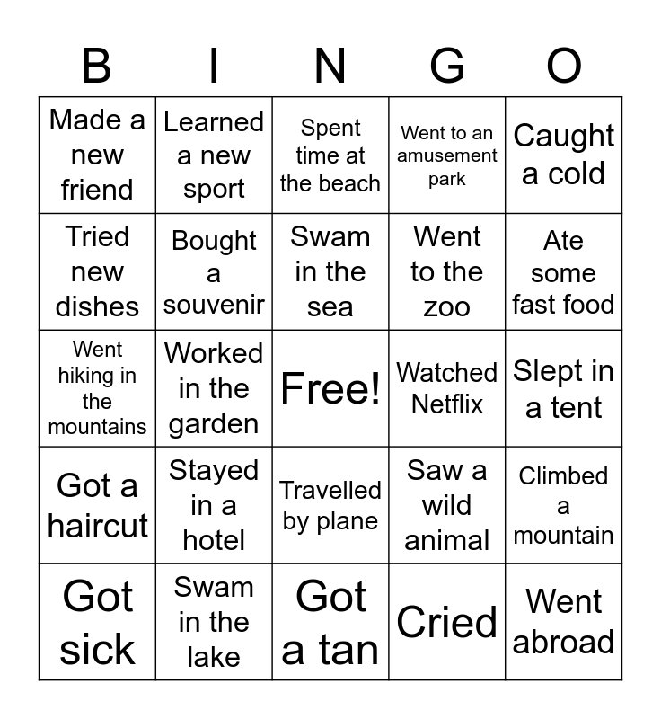This bingo card has a free space and 24 words: Stayed in a hotel, Swam in the lake, Swam in the sea, Got sick, Caught a cold, Made a new friend, Tried new dishes, Learned a new sport, Watched Netflix, Travelled by plane, Went to the zoo, Went hiking in the mountains, Saw a wild animal, Climbed a mountain, Bought a souvenir, Cried, Slept in a tent, Spent time at the beach, Ate some fast food, Worked in the garden, Went abroad, Got a haircut, Went to an amusement park and Got a tan.