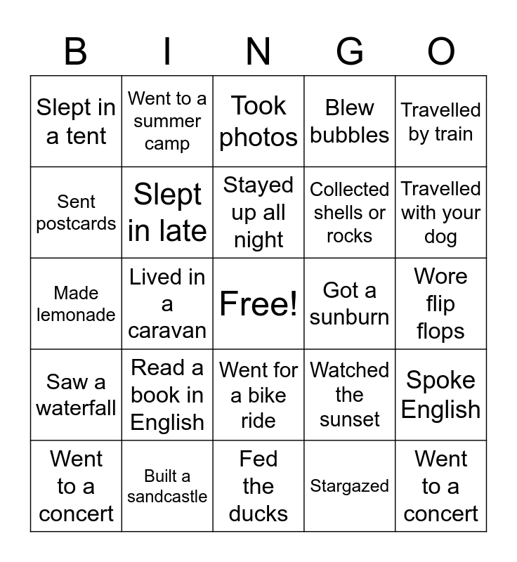 This bingo card has a free space and 24 words: Read a book in English, Built a sandcastle, Stayed up all night, Went to a concert, Travelled by train, Slept in a tent, Sent postcards, Went to a summer camp, Got a sunburn, Went for a bike ride, Collected shells or rocks, Made lemonade, Watched the sunset, Spoke English, Slept in late, Stargazed, Wore flip flops, Took photos, Travelled with your dog, Lived in a caravan, Went to a concert, Saw a waterfall, Blew bubbles and Fed the ducks.