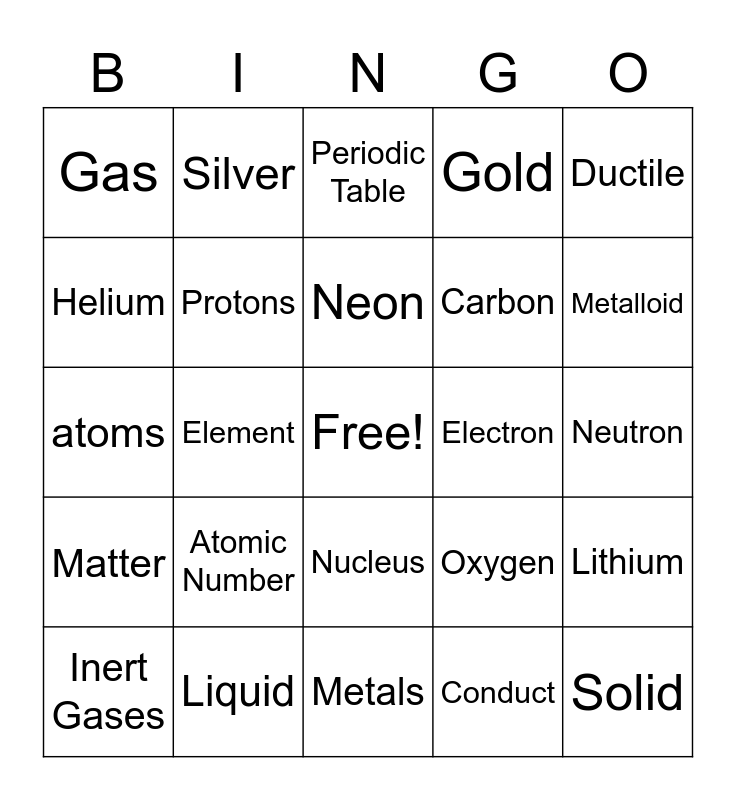 This bingo card has a free space and 29 words: Inert Gases, Mass, Element, Gravity, Gas, Periodic Table, Protons, Atomic Number, Electron, Liquid, Neutron, Solid, Metals, Conduct, Metalloid, Nonmetal, Nucleus, Matter, Ductile, atoms, Oxygen, Nitrogen, Carbon, Helium, Gold, Silver, Lithium, Neon and Hydrogen.