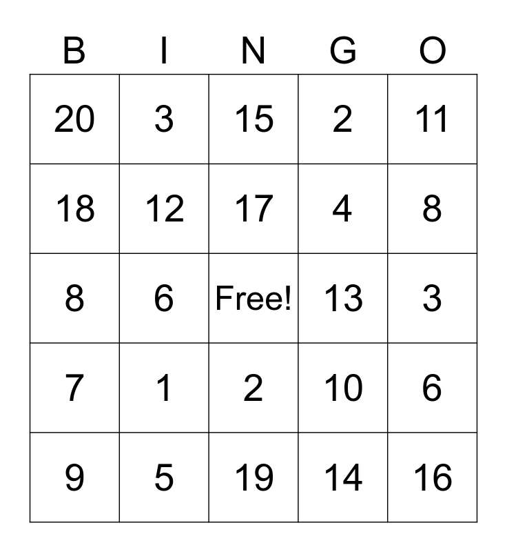 This bingo card has a free space and 24 words: 1, 5, 17, 9, 11, 20, 18, 3, 13, 2, 4, 8, 10, 6, 12, 14, 3, 15, 8, 6, 16, 7, 2 and 19.