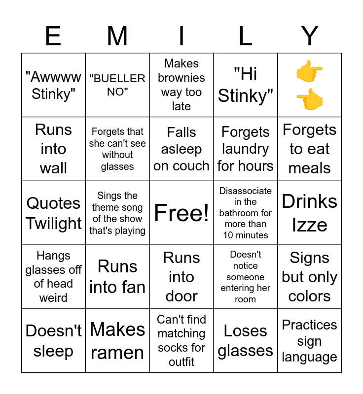 This bingo card has a free space and 24 words: Runs into fan, Makes ramen, Falls asleep on couch, Doesn't sleep, 👉👈, "Awwww Stinky", Runs into wall, "BUELLER NO", Disassociate in the bathroom for more than 10 minutes, Runs into door, Forgets laundry for hours, Quotes Twilight, Doesn't notice someone entering her room, Signs but only colors, Forgets that she can't see without glasses, Loses glasses, Drinks Izze, Makes brownies way too late, Forgets to eat meals, Sings the theme song of the show that's playing, Practices sign language, Hangs glasses off of head weird, "Hi Stinky" and Can't find matching socks for outfit.