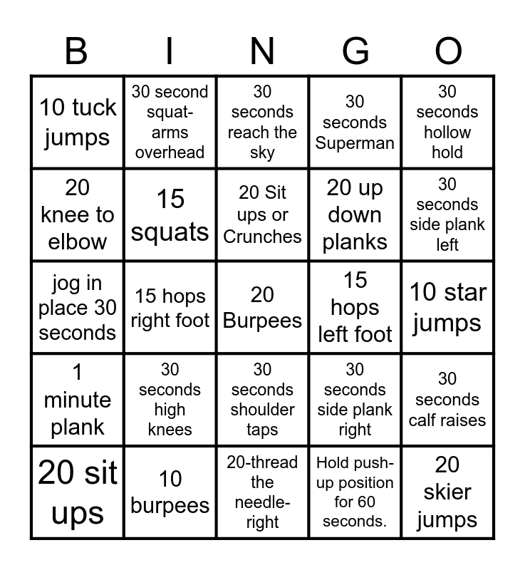 This bingo card has 40 words: Do 20 Push ups, jog in place 30 seconds, pretend jump rope 30 seconds, 15 squats, 10 burpees, 30 seconds shoulder taps, 20 Sit ups or Crunches, 30 drum majors, 30 seconds hollow hold, 1 minute plank, 15 hops right foot, 30 seconds Superman, 20 Burpees, 10 star jumps, 15 hops left foot, 30 seconds high knees, 30 seconds side shuffle, 10 tuck jumps, 20 Mountain Climbers, 30 seconds reach the sky, 30 seconds calf raises, Hold push-up position for 60 seconds., 20 up down planks, 20 knee to elbow, Do 20 Lunges, 10 sit and reach toes, 20 overhead side reach, 20 arm circles, 20 skier jumps, 30 seconds wall sit, 10 half turn jumps, 20 sit ups, 20 Russian Twists, 30 seconds side plank right, 30 seconds side plank left, 20-thread the needle- right, 20-thread the needle - left, 30 seconds tree pose, 30 second squat- arms overhead and Free Space.