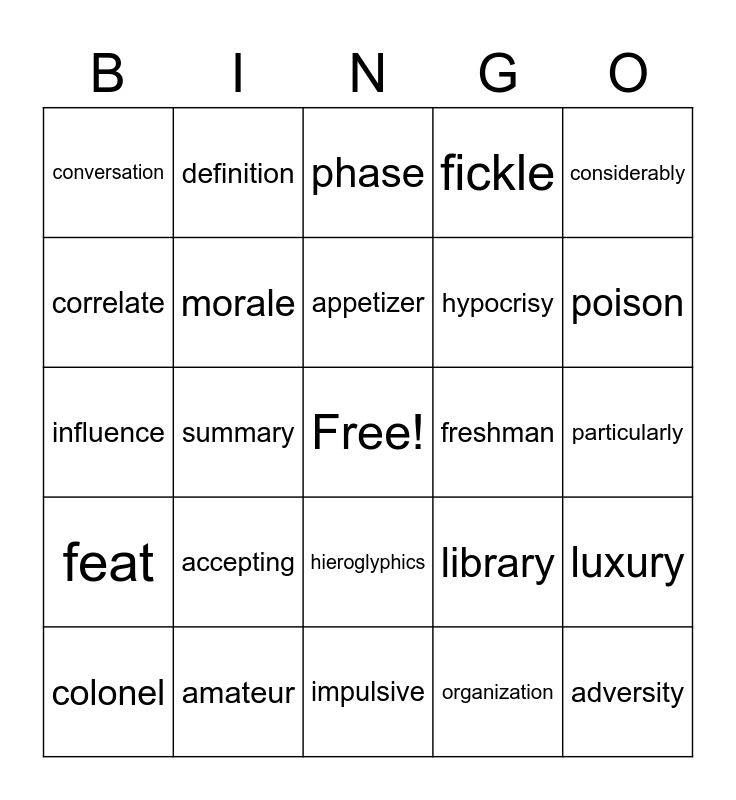 This bingo card has a free space and 24 words: accepting, amateur, appetizer, colonel, considerably, conversation, correlate, definition, freshman, hieroglyphics, hypocrisy, influence, library, luxury, morale, organization, particularly, phase, poison, summary, adversity, feat, fickle and impulsive.