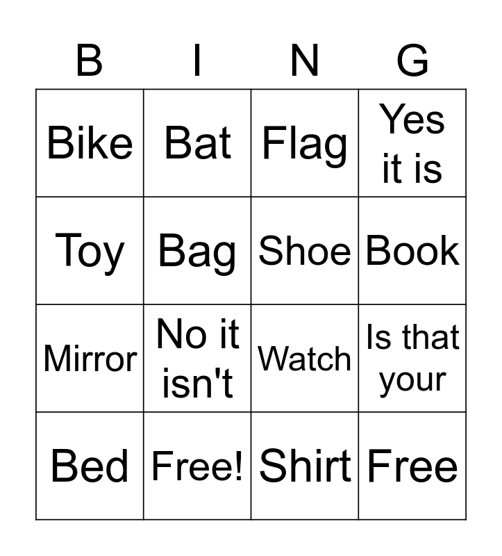 This bingo card has 16 words: Free!, Is that your, Flag, Bike, Mirror, Bat, Watch, Shirt, Toy, Bag, Bed, Yes it is, No it isn't, Book, Shoe and Free.