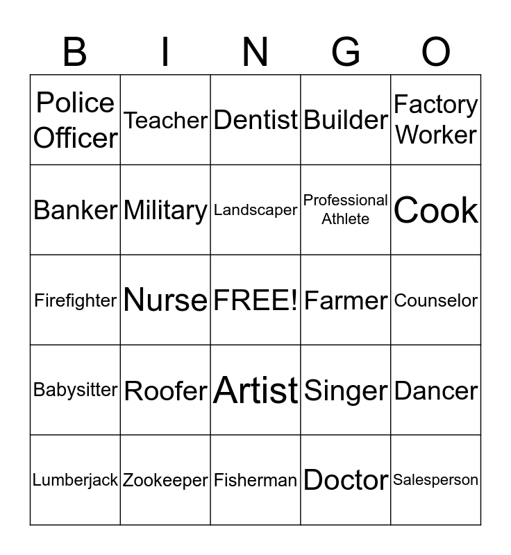 This bingo card has a free space and 24 words: Roofer, Zookeeper, Landscaper, Lumberjack, Factory Worker, Police Officer, Banker, Teacher, Farmer, Artist, Professional Athlete, Firefighter, Singer, Dancer, Military, Doctor, Counselor, Dentist, Cook, Nurse, Salesperson, Babysitter, Builder and Fisherman.