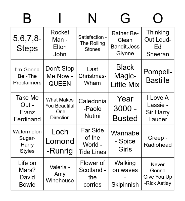 This bingo card has a free space and 24 words: Loch Lomond -Runrig, Valeria -Amy Winehouse, Last Christmas- Wham, Life on Mars? David Bowie, Thinking Out Loud-Ed Sheeran, 5,6,7,8-Steps, I'm Gonna Be -The Proclaimers, Rocket Man -Elton John, Year 3000 -Busted, Far Side of the World - Tide Lines, Black Magic- Little Mix, Take Me Out -Franz Ferdinand, Wannabe - Spice Girls, Creep - Radiohead, Don't Stop Me Now -QUEEN, Walking on waves -Skipinnish, I Love A Lassie - Sir Harry Lauder, Satisfaction - The Rolling Stones, Pompeii-Bastille, What Makes You Beautiful -One Direction, Never Gonna Give You Up -Rick Astley, Watermelon Sugar-Harry Styles, Rather Be-Clean Bandit,Jess Glynne and Flower of Scotland - the corries.