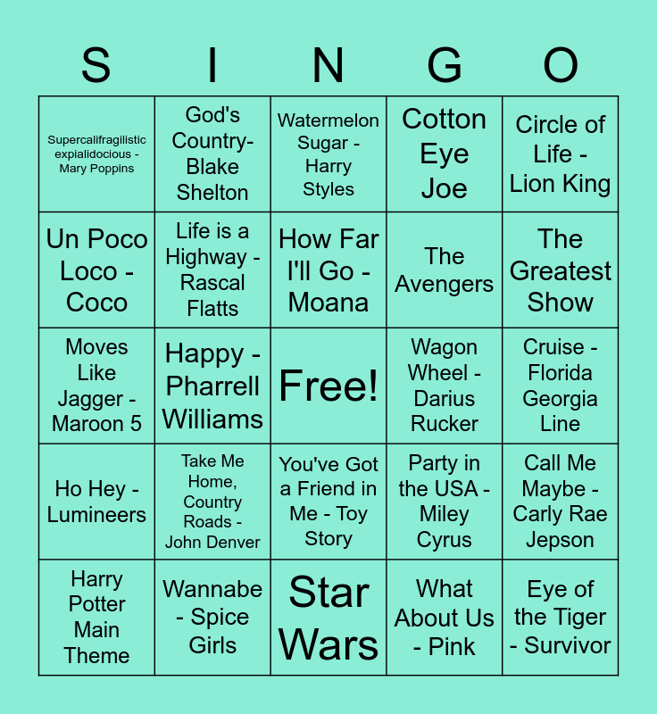 This bingo card has a free space and 39 words: Hello - Adele, This is How we Roll - Luke Bryan, Chicken Fried - Zac Brown Band, Life is a Highway - Rascal Flatts, Harry Potter Main Theme, You've Got a Friend in Me - Toy Story, How Far I'll Go - Moana, Gangnam Style - Psy, Circle of Life - Lion King, Ho Hey - Lumineers, Happy - Pharrell Williams, Cotton Eye Joe, Eye of the Tiger - Survivor, Cruise - Florida Georgia Line, Wagon Wheel - Darius Rucker, Take Me Home, Country Roads - John Denver, Under the Sea - Little Mermaid, Supercalifragilistic expialidocious - Mary Poppins, Shut Up and Dance - Walk the Moon, Party in the USA - Miley Cyrus, Un Poco Loco - Coco, Star Wars, The Avengers, The Greatest Show, Into the Unknown - Frozen, Somewhere Over the Rainbow, Strangers Like Me - Tarzan, Hakuna Matata- Lion King, All Star - Smash Mouth, God's Country- Blake Shelton, Friend Like Me- Aladdin, Mamma Mia - ABBA, Watermelon Sugar - Harry Styles, Wannabe - Spice Girls, What About Us - Pink, The Lion Sleeps Tonight- The Tokens, Call Me Maybe - Carly Rae Jepson, Moves Like Jagger - Maroon 5 and Barbie Girl - Aqua.