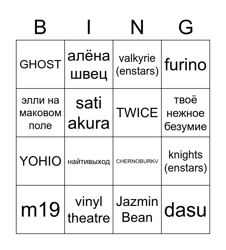 This bingo card has 16 words: vinyl theatre, knights (enstars), valkyrie (enstars), GHOST, YOHIO, алёна швец, CHERNOBURKV, Jazmin Bean, элли на маковом поле, sati akura, m19, furino, найтивыход, твоё нежное безумие, TWICE and dasu.