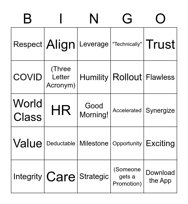 This bingo card has a free space and 24 words: Deductable, Care, Humility, Integrity, Trust, Respect, COVID, Align, Accelerated, Milestone, Rollout, World Class, Opportunity, Exciting, (Three Letter Acronym), (Someone gets a Promotion), Synergize, Leverage, Flawless, HR, Download the App, Value, "Technically" and Strategic.